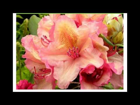 Storblomstret Rhododendron med store smukke rosa-orange blomster i maj måned.