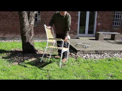Elegant, klassisk stabel havestol. Hvidt stel i aluminium samt sæde og ryg i teaktræ.