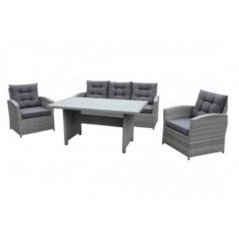 Materialet er polyrattan i farven Grey mix. Bordet har nonwood bordplade, Sættet leveres komplet med kraftige sæde og ryghynder i grå polyester. Alle hynder har vaskbart betræk.